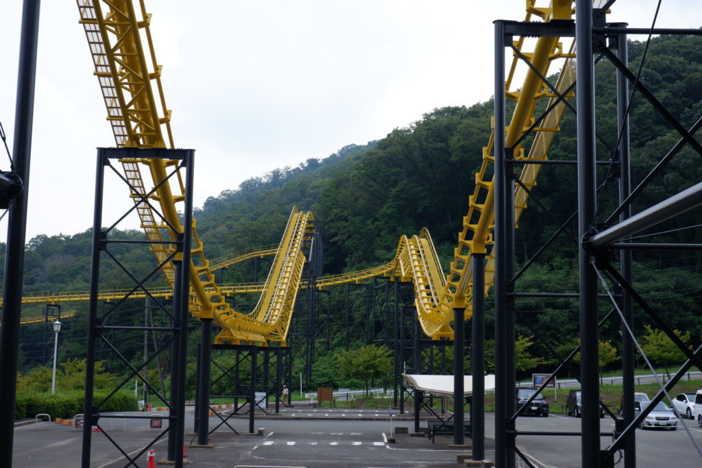 広大な駐車場に降り立つと、複雑にレールが絡み合う魑魅魍魎のローラーコースターたちの姿が現れます。その中でもひときわ目立つのが、鮮やかなイエローのレールの「Go!Go!ジェット」です。