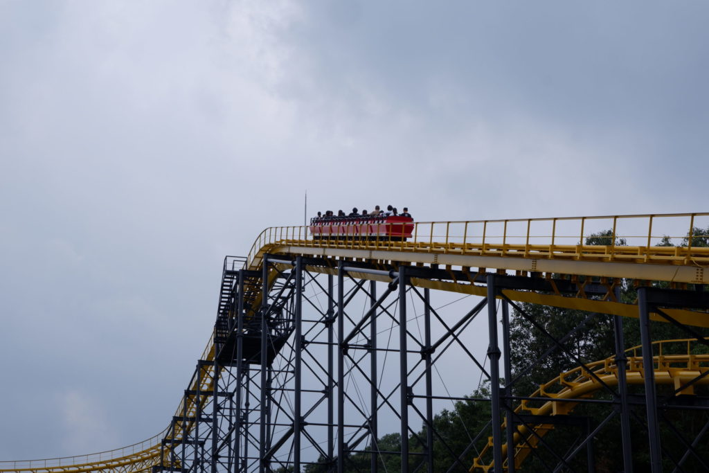 出発すると、まずは最高地点の高さ28mまでゆっくりと巻き上げられます。なかなかの高度感からの、最高速度65km/hでファーストドロップ!