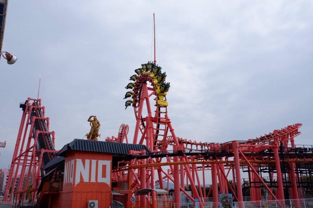 少し珍しい吊り下げ式コースターも、なんと「グリーンランド」には2つあります。怖さ抑えめの「グランパスジェット」(左写真)や、すごく怖そうな「NIO」(右写真)です。