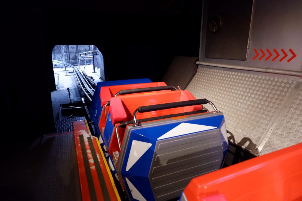 宇宙空間に見立てた屋内空間を走るコースターは、どこかテーマパークのような特別感があります。
