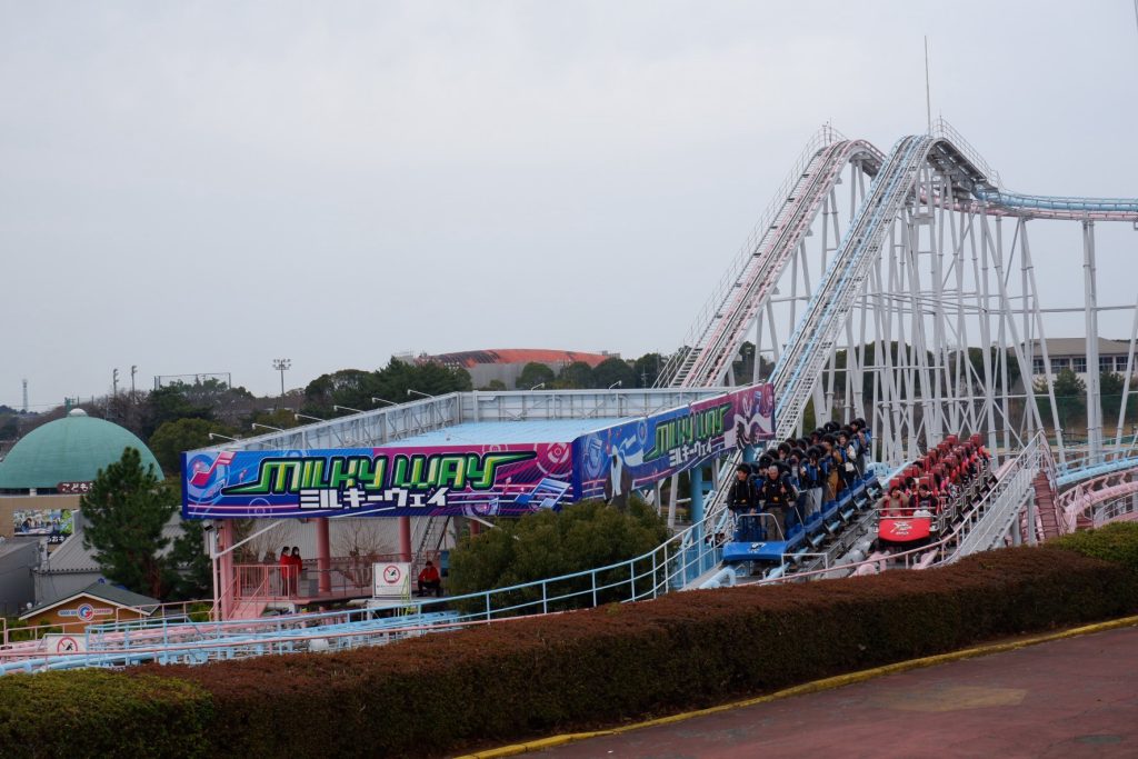 絶叫マシン好きにおすすめなのが、立ち乗りコースターの「ミルキーウェイ彦星」(写真 青)と座り乗りコースターの「ミルキーウェイ織姫」(写真 ピンク)。規模では恐竜コースターに劣るものの、スリルはこちらが圧倒的でしょう。(怖いので乗ってません)。