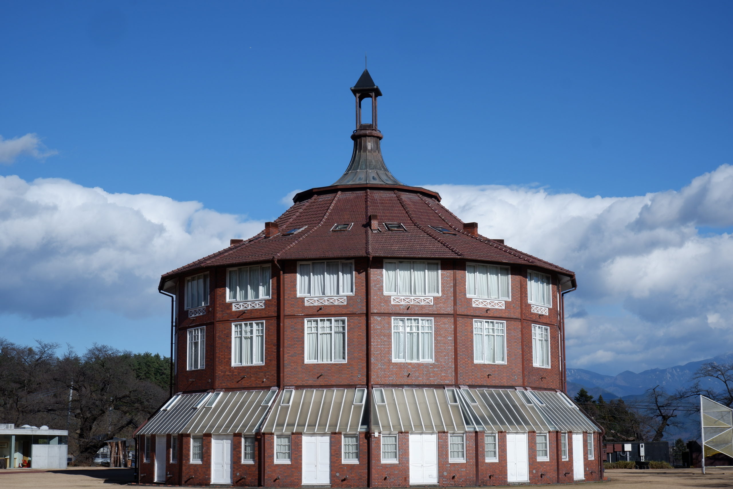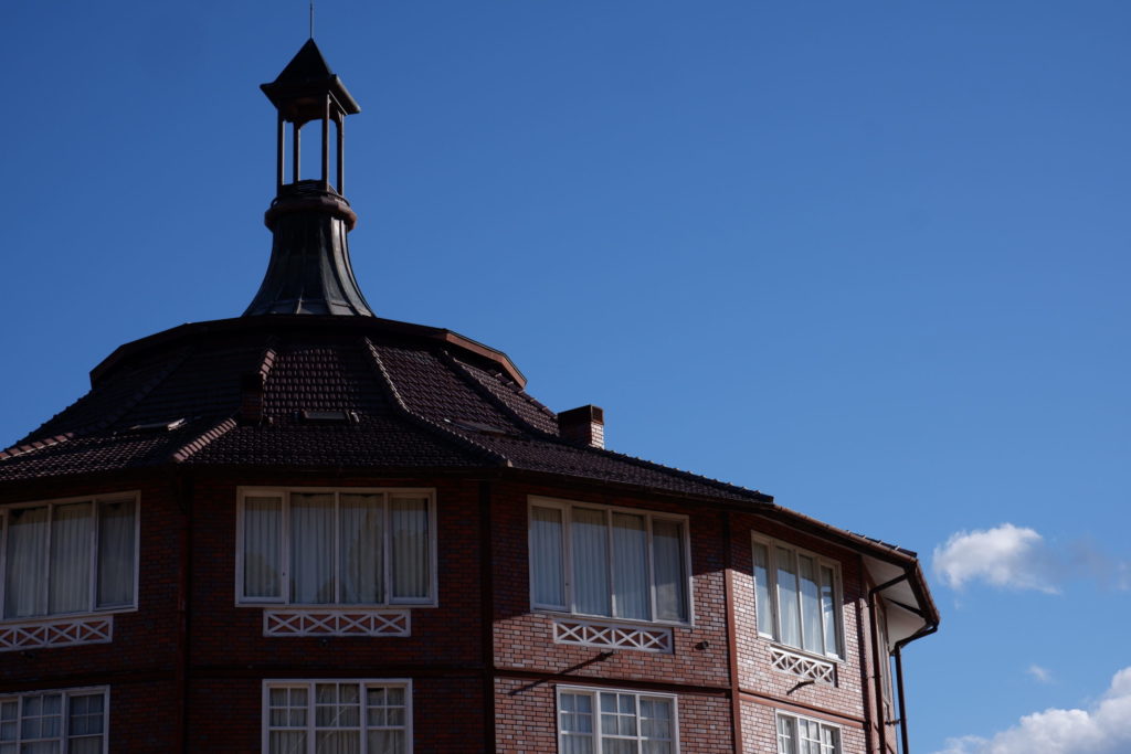 まるで西洋の城や要塞のような円形の建物ですが、実際には正十六角形となっています。また横幅が大きくどっしりとした姿は、重量感がありますが、一方で屋根から尖塔にかけてのスラッとしたデザインは「塔」のような印象を抱かせます。