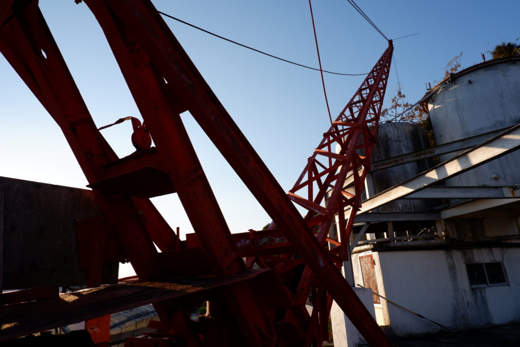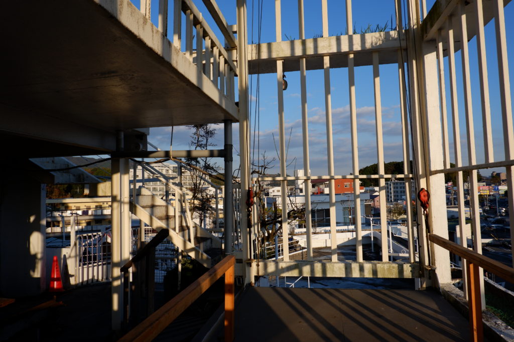 天高くそびえ立つ業務用エレベーターは、まるで西洋建築の尖塔や時計塔のような趣があります。塔の付いた建物は、問答無用でカッコいいものです。