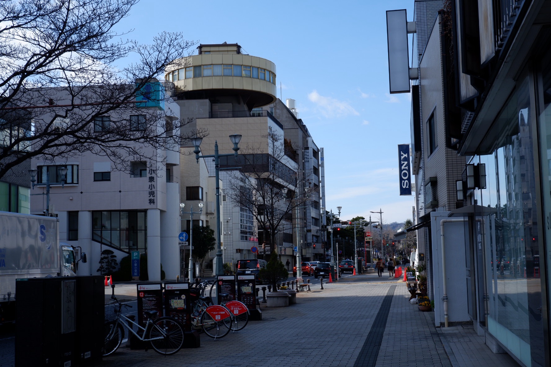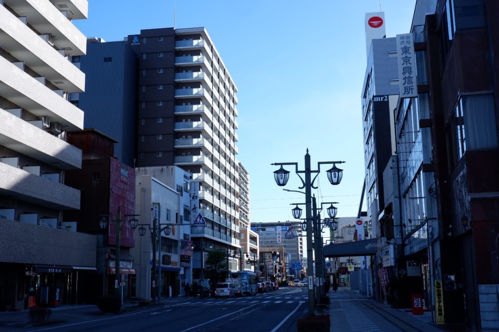 (寂れた)繁華街である中央銀座に対して、こちらはオフィス街の趣です。沿道にはマンションや雑居ビルなどが建ち並びます。