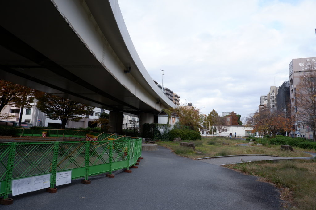 高架の下には、阪東橋公園が広がります。ここでかつての運河は少し向きを変えて、根岸湾方面へ向かいます。