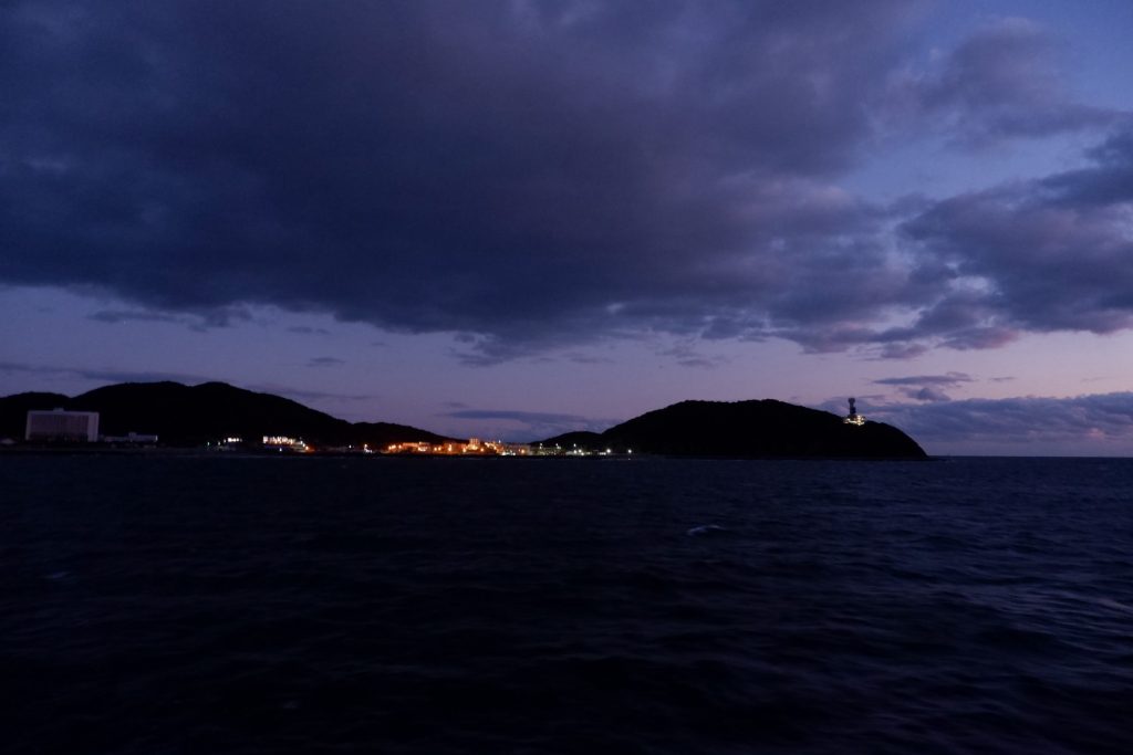 船内は “帰りの乗り物の中” か雰囲気。眠っている人も多く、静かな空間です。外に出てみると、伊良湖岬の灯台と街明かりが見えてきました。