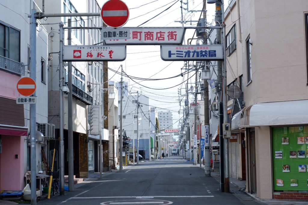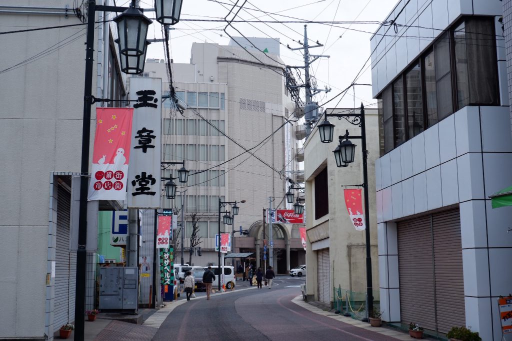 国道17号沿い:中心市街地を東西に横断するメインストリート。百貨店や金融機関などが並ぶ。