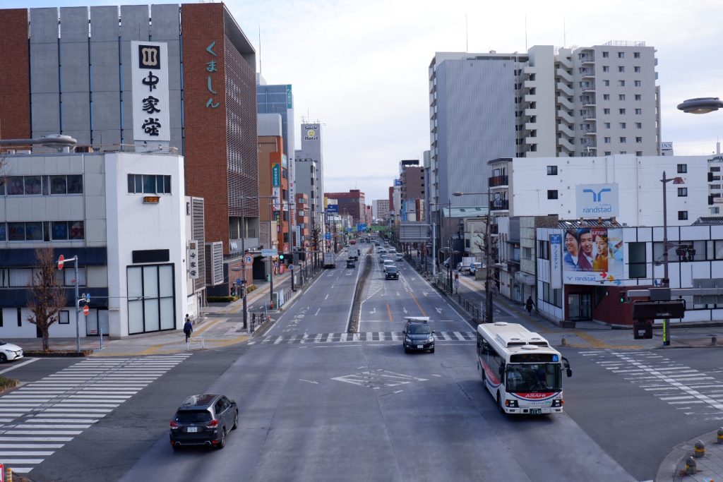 中心市街地を貫く4車線の幹線道路。ビルやマンションの並ぶ街並みの中を路線バスの行き交う光景は、これぞ街のメインストリートです。
