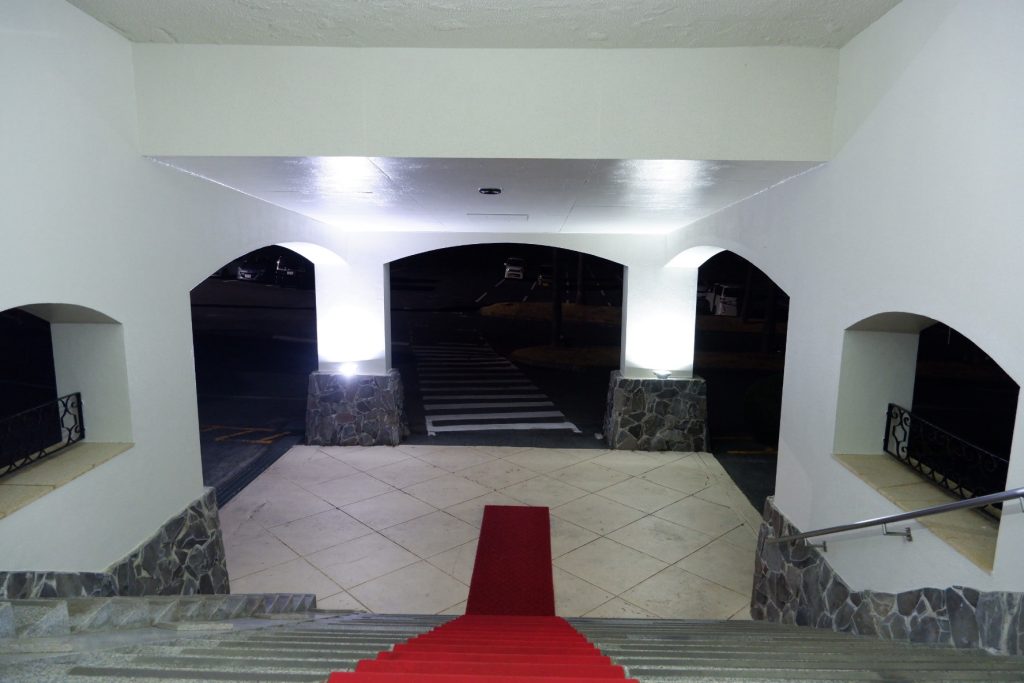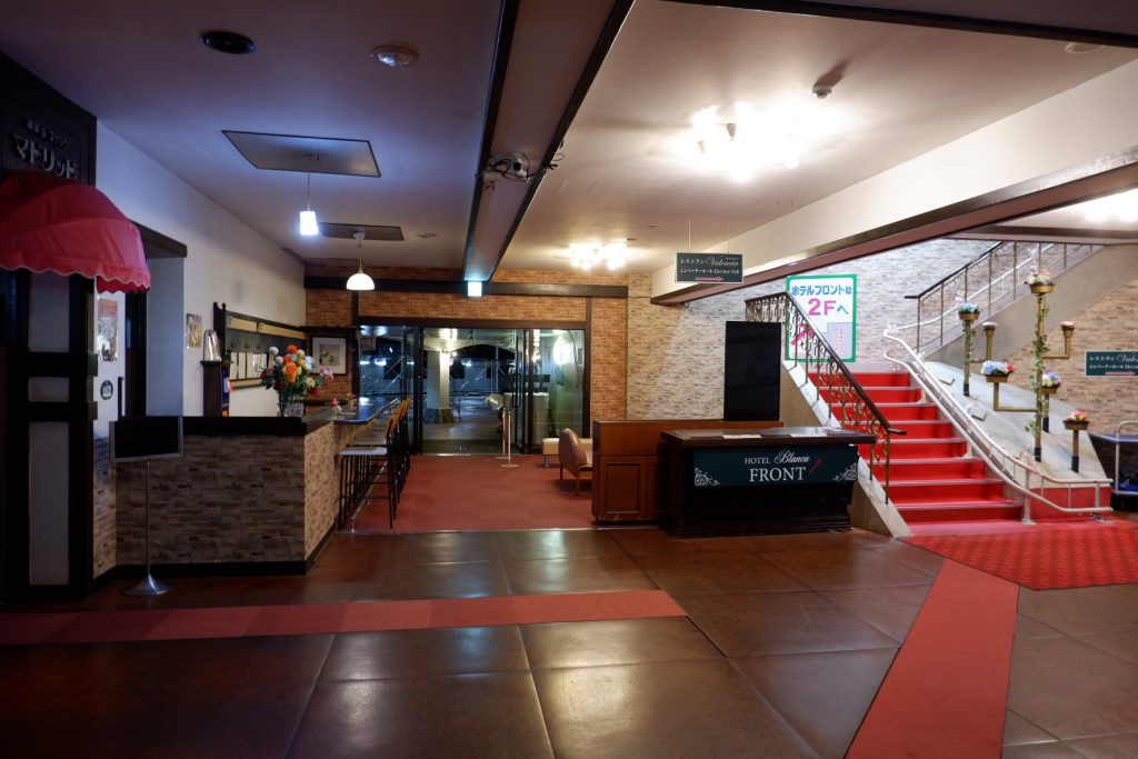 今宵の宿「ホテル ブランカ」は、遊園地のメインエントランスとは反対側の北のはずれに位置しています。あたりは駐車場やゴルフ場があるだけの真っ暗闇で、その中に古めかしいホテルがぼうっと浮かび上がりました。