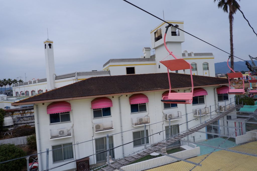 リフトから見える「ホテルブランカ」は、それはそれは古めかしく、独特な雰囲気を醸し出しています。山頂には魔女をモチーフにしたアトラクションや、廃墟を使ったお化け屋敷がありますが、麓のホテルも相まって、どこかおどろおどろしさを感じさせる場所となっています。