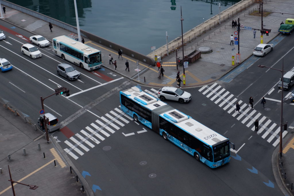 足元を見ると、ちょうど西鉄の連節バスが国道199号(勝山通り)を通っていきました。
