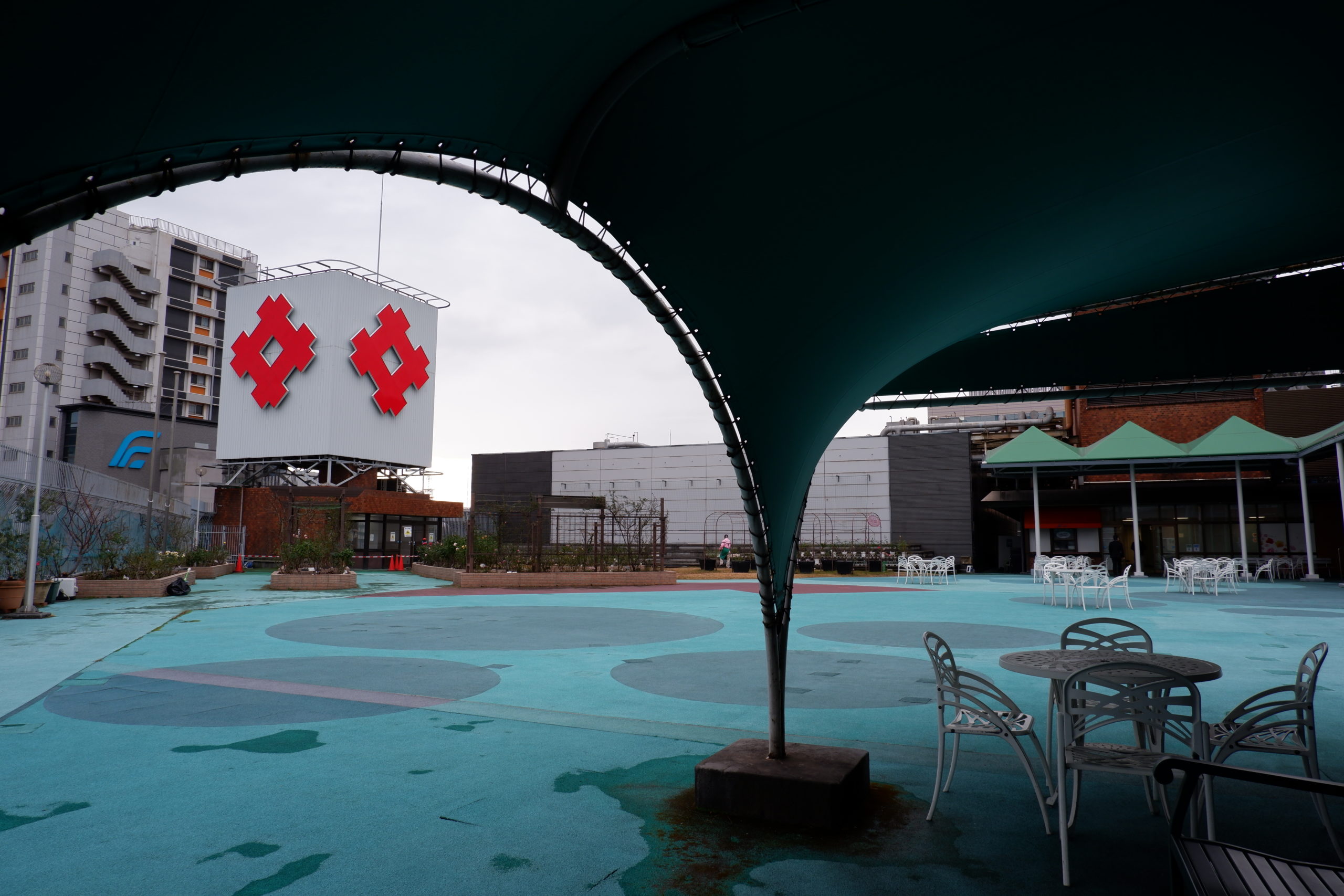 福岡県北九州市小倉区にある、老舗百貨店の屋上広場。開放感溢れる空間から、迫力ある都市景観を一望することができました。