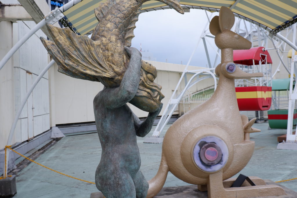 観覧車のそばには、かつてのオリエンタル中村百貨店のシンボルであった「カンガルー像」や「鯱を抱えた少年像」も展示されており、その様子はさながら ”デパート屋上遊園地の博物館” です。