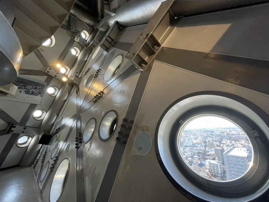 近未来的な見た目ですが、中身は1990年代の少し古い公共施設であり、地に足のついた展望塔です。
