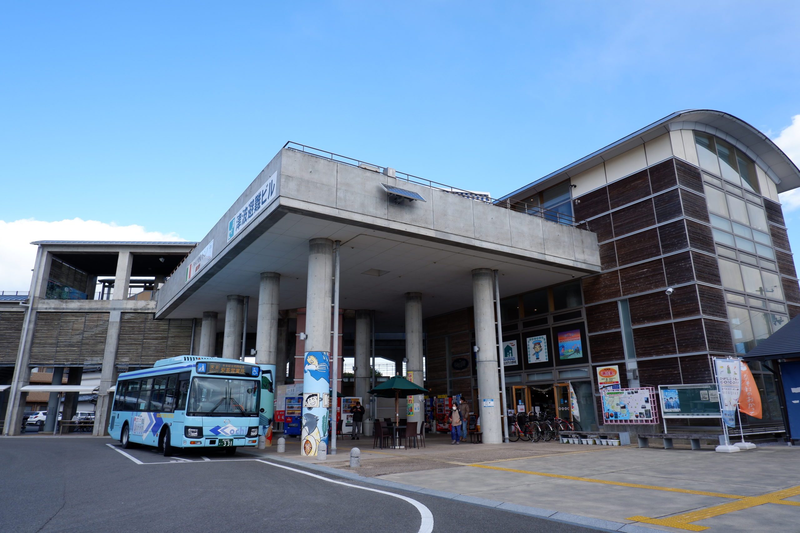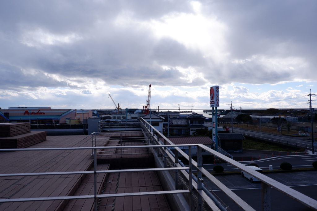 津波避難ビルの上は、平時は展望テラスとして開放されています。南側を見れば奈半利港と、その先には太平洋まで見渡すことができました。