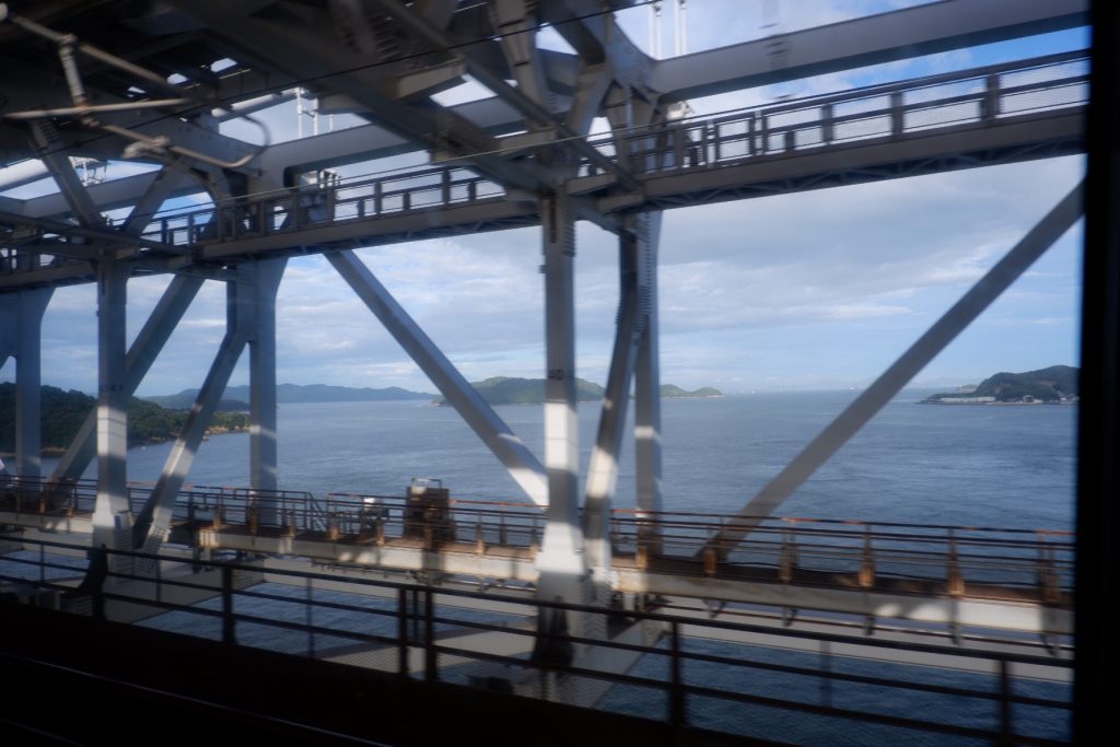 昨日の夜は東京にいて、寝ているだけで、寝ているままで、朝起きたら瀬戸内海の真っ只中にいる。瀬戸大橋通過は、出雲では味わえない “瀬戸だけの楽しみ” です。