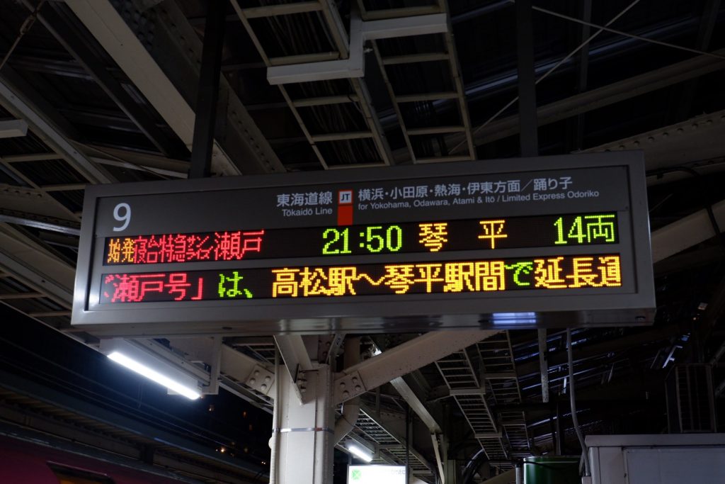 東京21:50 横浜22:15・・・高松7:27 琴平8:39