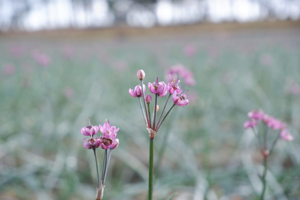 集落とは小高い丘と防砂林で隔てられており、海岸へ近づくとらっきょう畑が広がりました。このあたりは県内有数のらっきょうの産地で、ちょうど紫の花が見ごろを迎えてました。