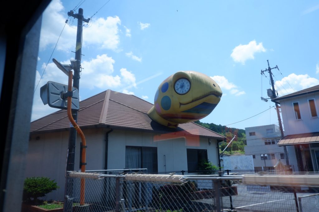 列車は、「カメ」のような見た目の駅舎の「亀甲駅」に着きました。ここまでやってくると、津山はもうすぐです。