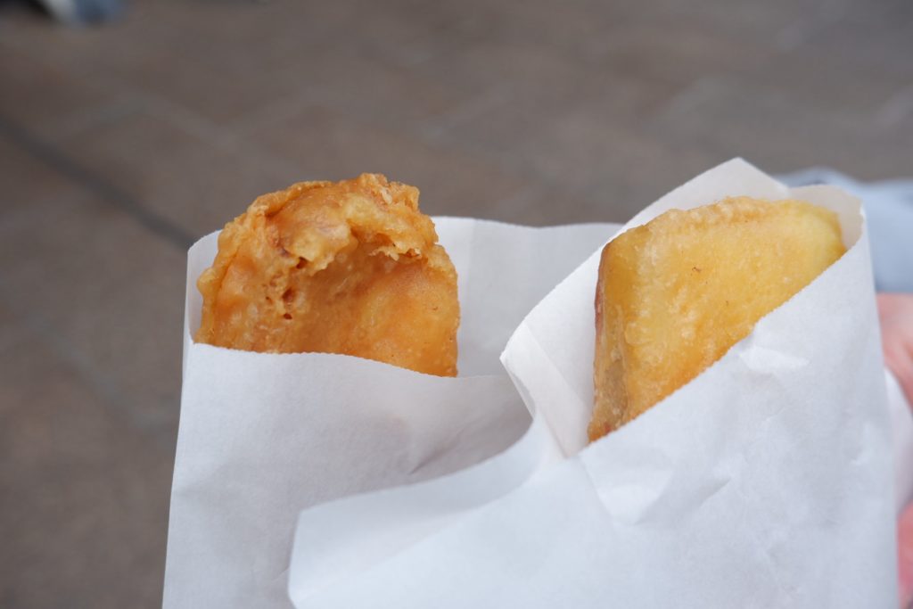 お惣菜屋さんでお芋の天ぷらをテイクアウトして、近くのベンチで食べました。街歩きや、路面電車の乗りつぶしの最中にもちょうどいい、ちょっとした食べ歩きグルメです。