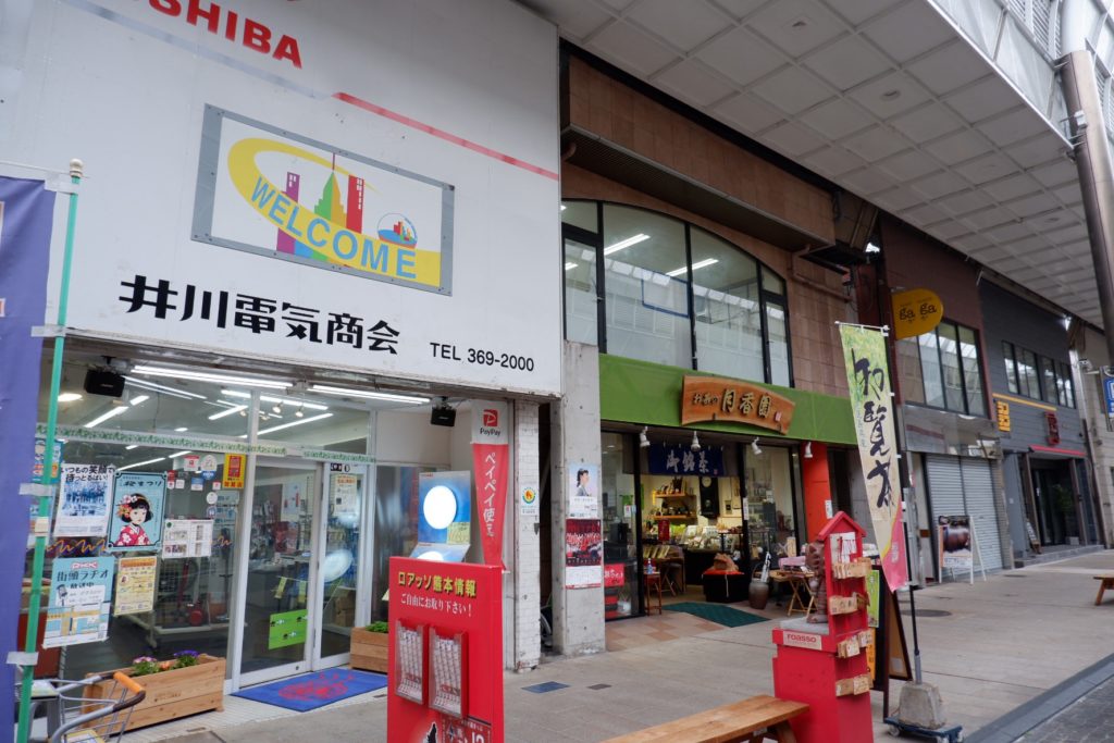 新市街や下通、上通と比べればだいぶ小さな商店街ですが、お店はしっかり開いています。自動車社会の郊外エリアで、歩行者中心の商業空間として奮闘しているようです。中ほどにはスーパーマーケットもあります。