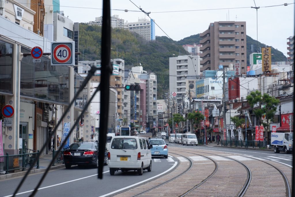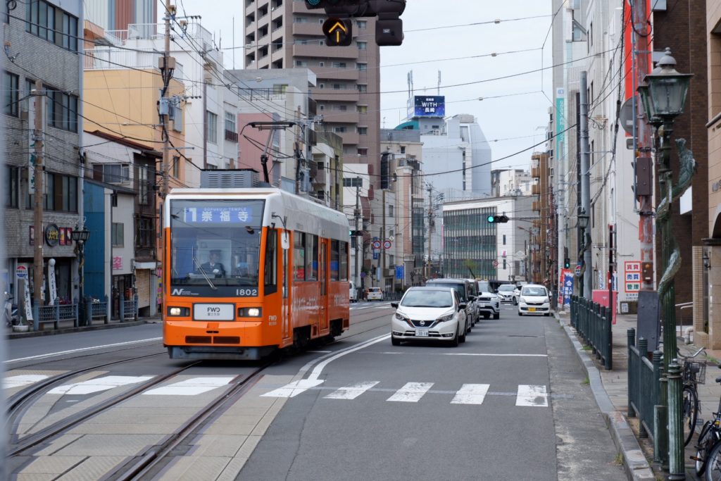 県内随一の繁華街は「観光通り」「思案橋」電停の周りに広がっており、百貨店や商店街が並んでいます。ところが、その1つ隣の「崇福寺」電停になると中心市街地が突如終わりを迎えます。