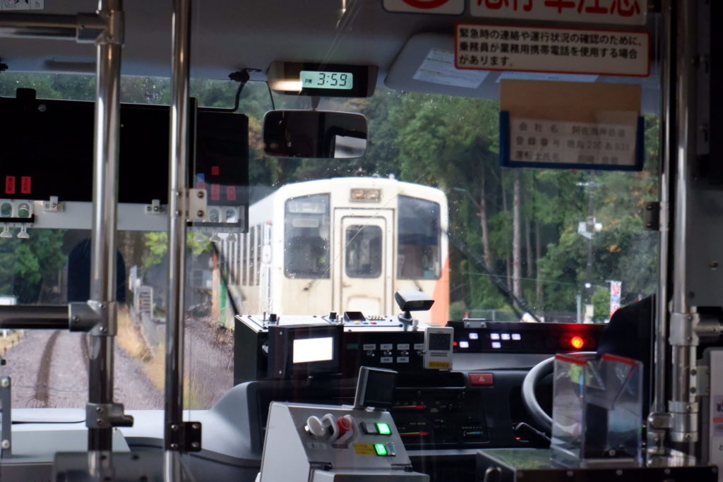 起点の「阿波海南文化村」を出発したDMVは、ここまでバスとして道路を走り、この先は鉄道として線路を走ります。