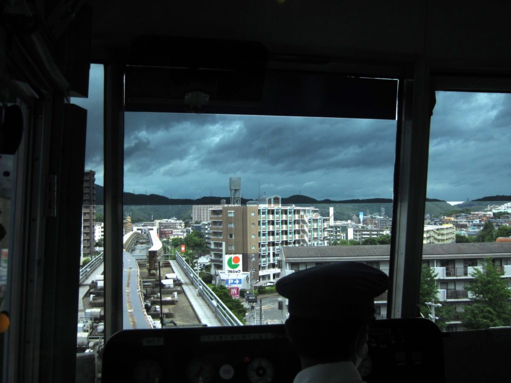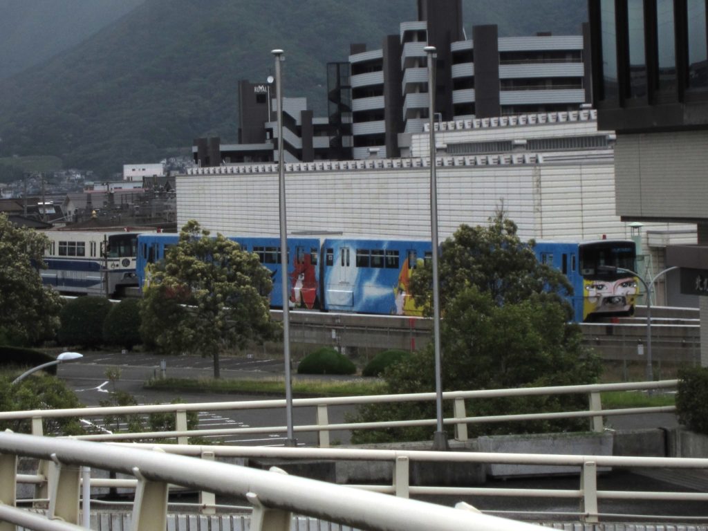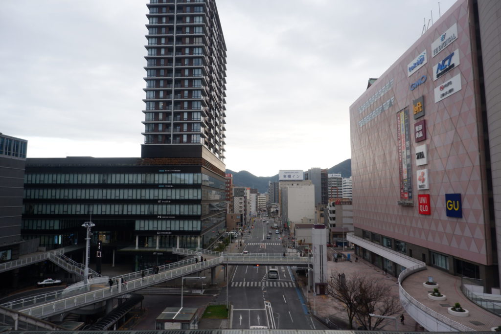 「平和通駅」を出ると、さらに勾配を上って、ホテルやアミュプラザを擁する駅ビルへダイレクトに突っ込みます。車窓からの最大の見どころです。