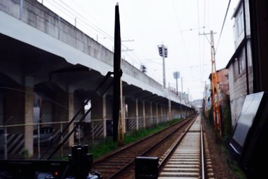 その後はしばらく専用軌道が続きます。JRの高架線沿いを走り、周辺には平和公園や運動場が広がります。郊外色の濃いエリアです。