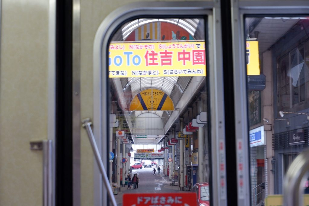 「長崎大学」「千歳町」では多くの乗降がありました。沿線には集合住宅や雑居ビルが立ち並び、ついにはアーケードの姿が。