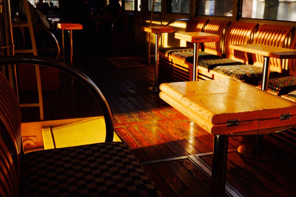 西日が車内に入り込んで、木材を優しく照らします。座席はロングシートながらも、机があることで、観光列車ならではの特別感を演出しています。貸切運転をしたら、食事を楽しむこともできそうですね。