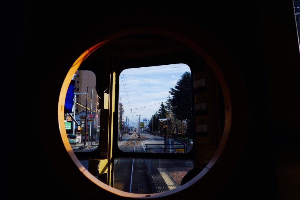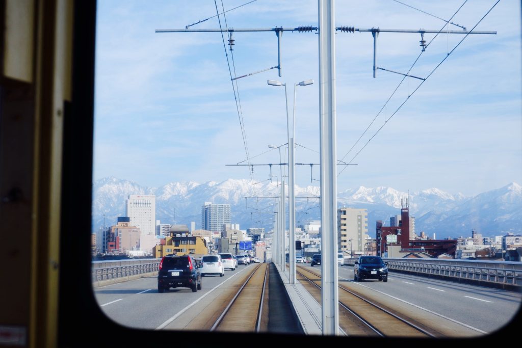 丸く切り取られた車窓から、富山中心市街地を突き進む様子や奥にそびえる北アルプスの山々を眺めます。広大な平野と3000m級の山並み、富山ならではの組み合わせです。